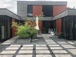 Der Hausgarten um das L-förmige Gebäude im Bungalowstil mit Garagenanbau liegt an zwei Seiten an einer Zufahrtstraße zu einem Wohngebiet und ist eingerahmt von Zäunen und Mauern der Nachbarn. Zwischen Straße und Haus sind teilweise Abstände von 3,20m bis 7,50m und zum Nachbarn sind auch lediglich Abstände von lediglich 3,00m vorhanden. Aufgrund dieser Enge und den Bedürfnissen des Bauherrn um das Gebäude herumgehen zu können sowie unterschiedliche Nutzungsbereiche zu kreieren, wurde das Büro SUD[D]EN beauftragt ein Konzept zu entwickeln, welches der Enge des Grundstücks gerecht wird, Pflegeleichtigkeit mit Nutzungsvielfalt kombiniert und den vorhandenen Bambus integriert.